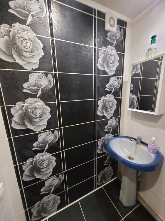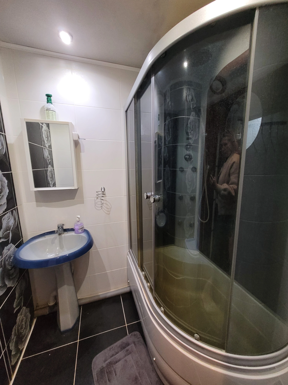 В ванной кафельная плитка, установлена душевая кабина, умывальник с зеркалом.