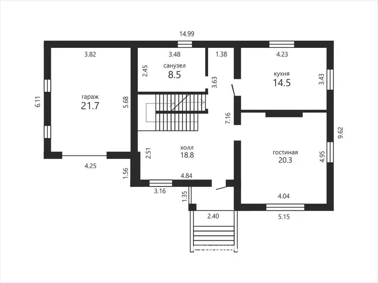 - 1-ый этаж с просторным холлом, кухней, гостиной, санузлом и гаражом;