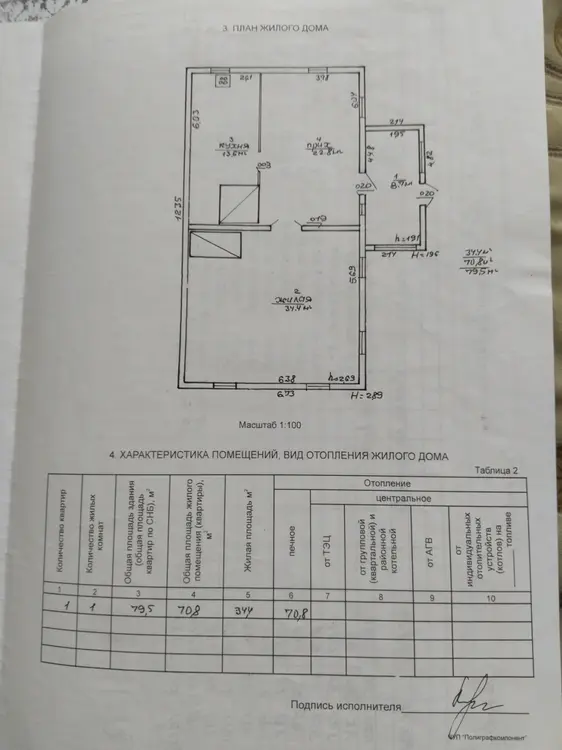 Дом бревенчатый. Общая площадь 79,5 м.кв. В доме 2 просторные жилые комнаты -22.8 и 34.4 м.кв., выделена кухня -13.6 м.кв., веранда. Окна деревянные. Отопление печное (2 печки с лежанкой). Имеется газовая плита с баллоном. Есть возможность провести электроотопление! И сделать скважину! Санузел на улице.
