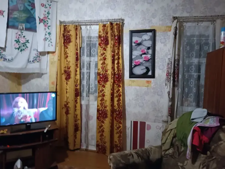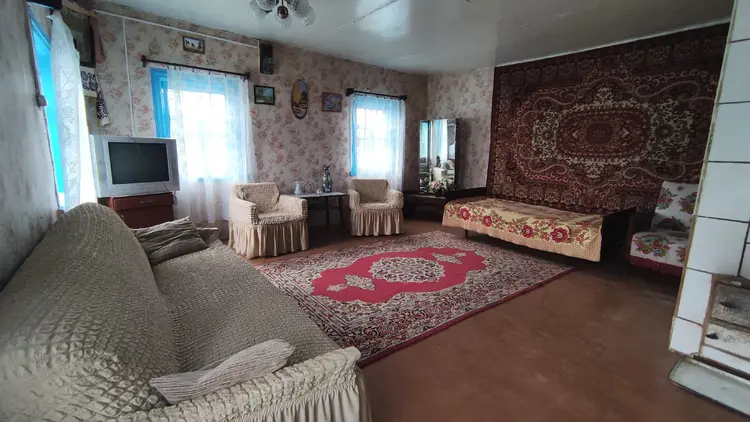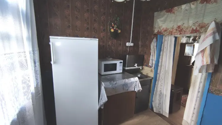 Общая площадь 42 кв.м. Планировка включает в себя 2 комнаты: большая гостиная 26,6 кв.м. и передняя 10,33 кв.м., кухня 5 кв.м. В доме высокий крепкий фундамент. Водоснабжение – колодец, скважина. Отопление печное. По улице заменен силовой кабель и проложен газ.