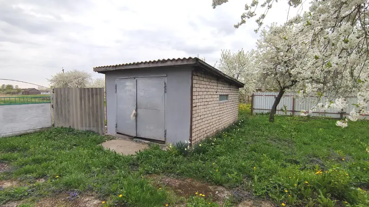 На участке площадью 0,25 га растет большой фруктовый сад: яблоня, абрикос, груша, слива, малина, есть сарай, погреб, гараж.