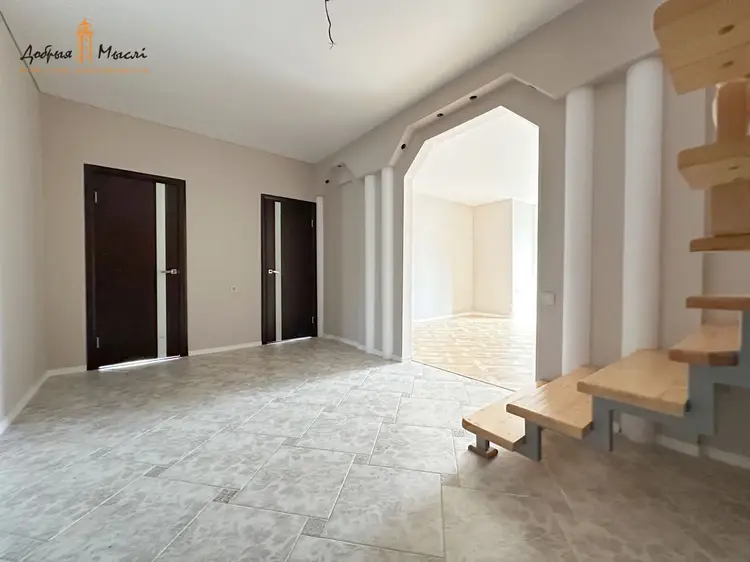 Полы на первом этаже в зале, кухне - плитка, в санузле, коридоре и прихожей - плитка, в гостиной и жилой - ламинат. На первом этаже теплые полы. Полы 2-го этажа — ламинат. Натяжные потолки, выключатели и розетки Schneider Electric.