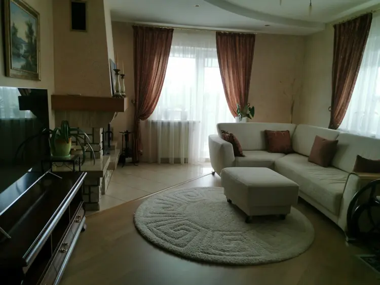 первый этаж. Большая гостиная 36,2 кв.м, печь-камин, на полу паркетная доска. Встроенная кухня 18,6 кв.м с бытовой техникой. Санузел.