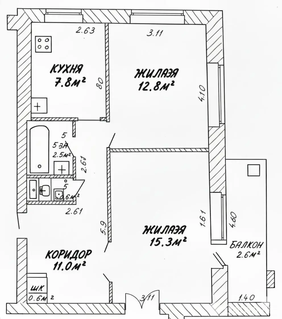 Комнаты: 15,3+балкон и 12,8 кв.м, кухня 7,8 кв.м. Просторный коридор11 кв.м.