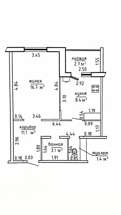 Площадь квартиры: 43,4 м2 - по СНБ/ общая площадь - 40,7/ жилая - 16,7 2/ просторная кухня - 8,4 м2. Большая лоджия. Санузел раздельный