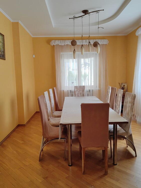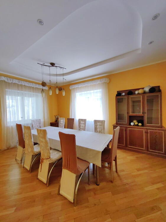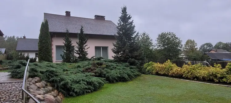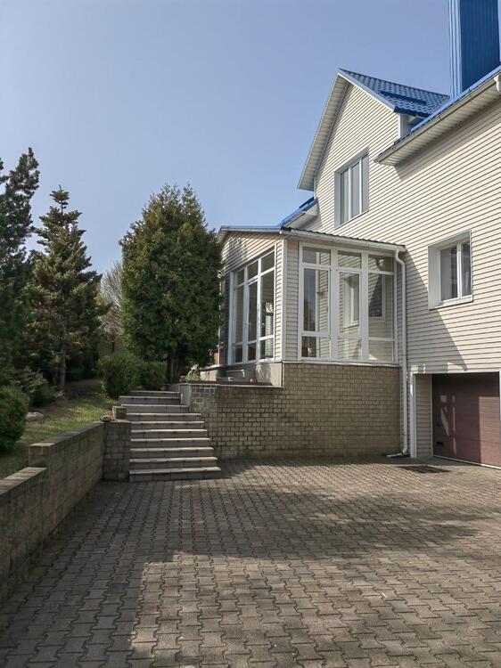 1. двухэтажный жилой дом с цокольным этажом. В цокольном этаже находится гараж, топочная и другие подсобные помещения. На первом этаже есть кухня и большая гостиная с камином. На мансардном этаже три комнаты с балконом. В доме два санузла. Дом подготовлен под чистовую отделку. На первом этаже внутренняя отделка уже частично выполнена.