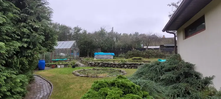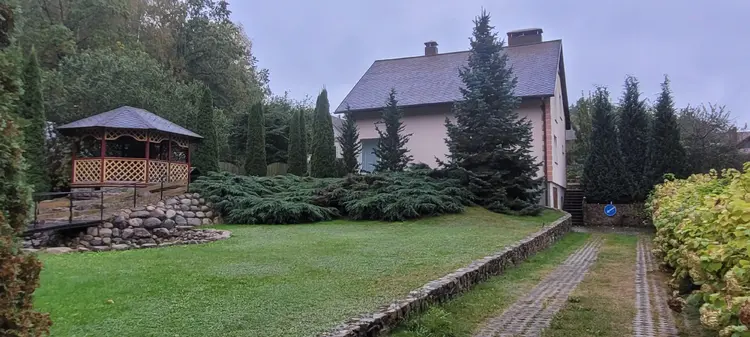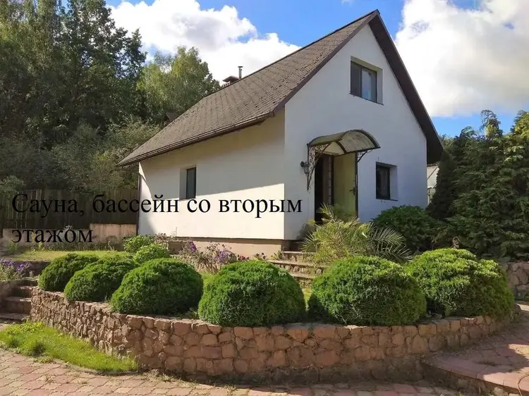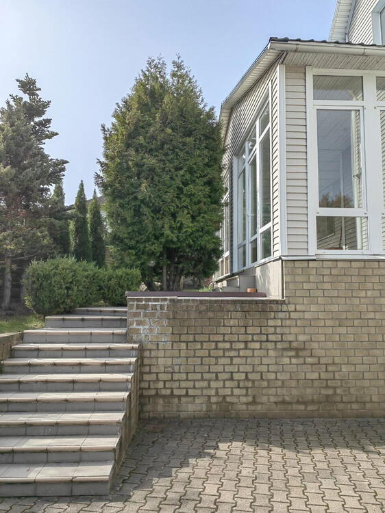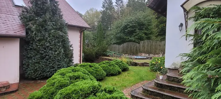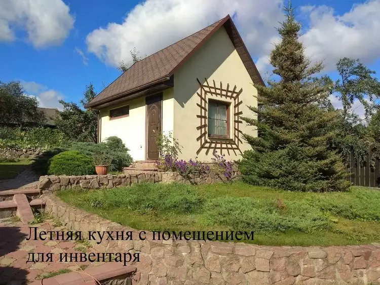 Земельный участок с ландшафтным дизайном, спланированный терассами. Опорные стенки терасс выложены камнями, дорожки вымощены плиткой. Непосредственно на самом участке есть летний бассейн, пруд с декоративным мостом, вымощенный камнями, газон, цветочные клумбы. Организована зона отдыха с беседкой и печью-барбекю. На участке много зелени. Помимо сортовых плодовых деревьев растет множество декоративных растений и цветов, создающих необыкновенную гармонию и красоту.