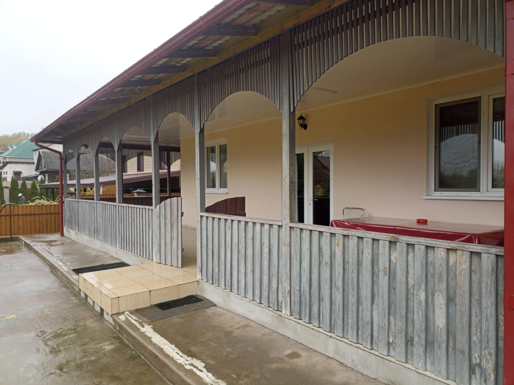 На территории:бассейн,гараж,два навеса,много места для парковки,две террасы (с двух сторон дома)