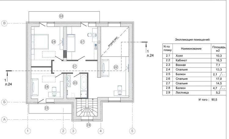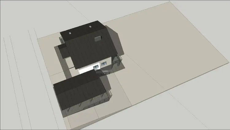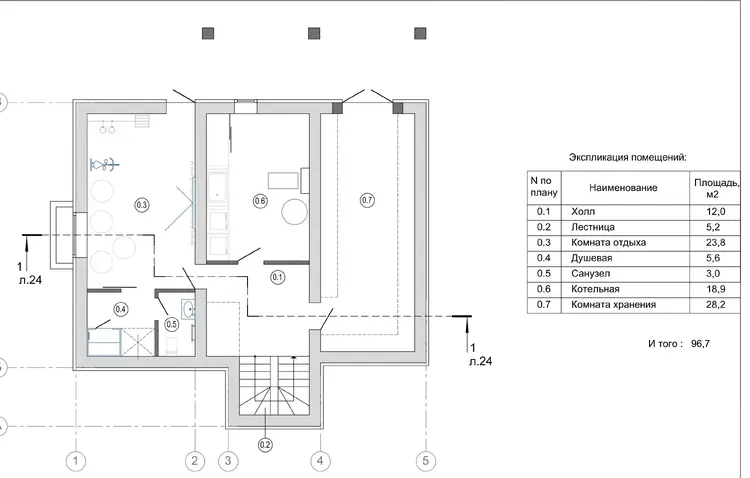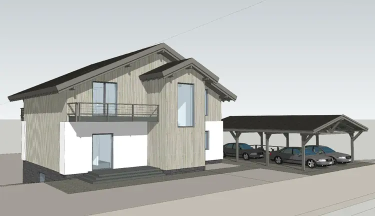 Два этажа и цокольный этаж, устроенный по принципу шале. С обратной стороны, дом выглядит как трехэтажный.