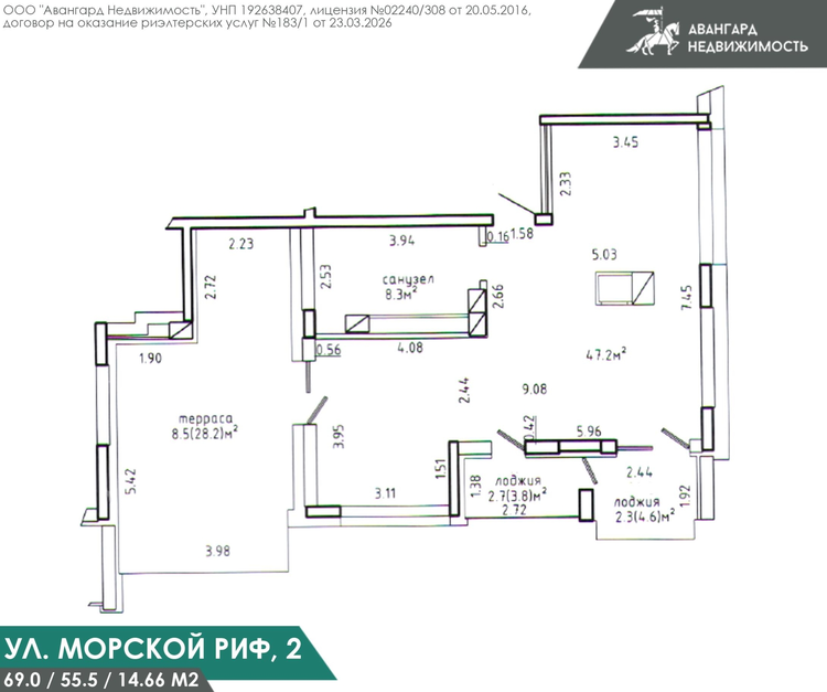 Двухкомнатная квартира 69 м2 по СНБ (площадь с террасой – 88.7м2): Просторная кухня-гостиная с камином, спальня, совмещенный санузел, лоджия, балкон и уединенная терраса 28.2 м2.