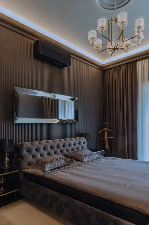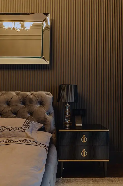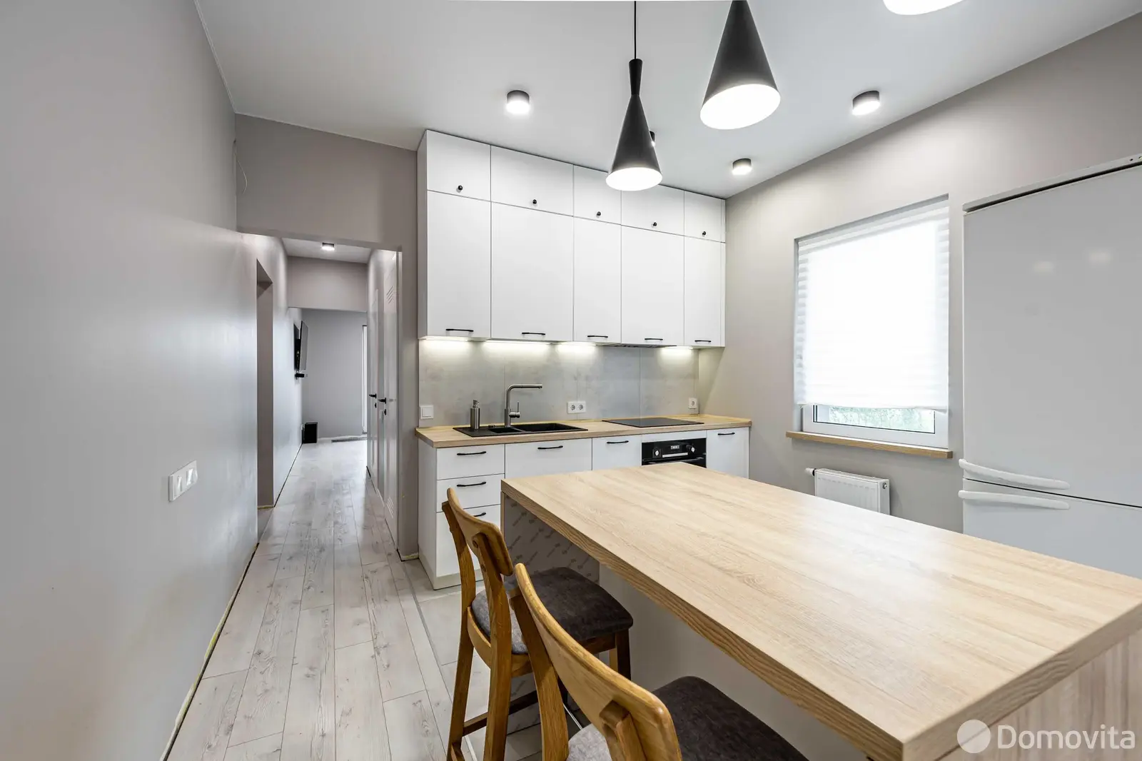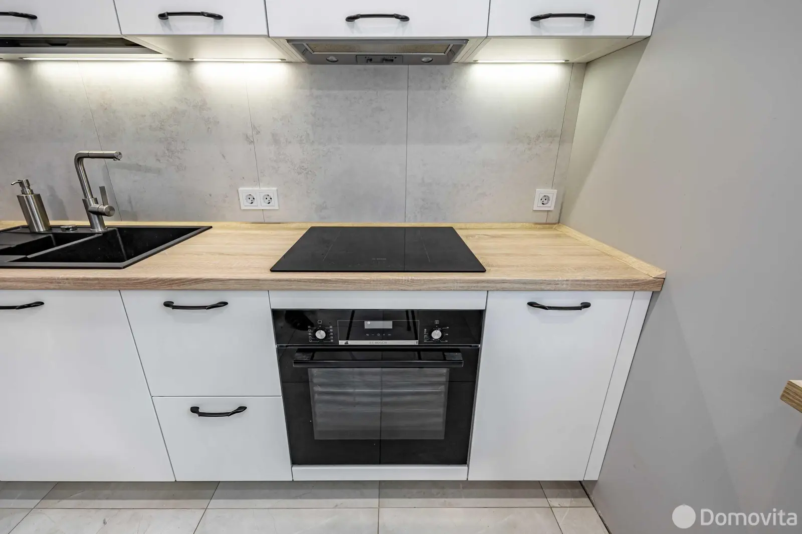 Встроенная кухня с доводчиками и техникой (индукционная варочная поверхность и духовой шкаф Bosch, вытяжка). Кухня оборудована барным столом-островом.