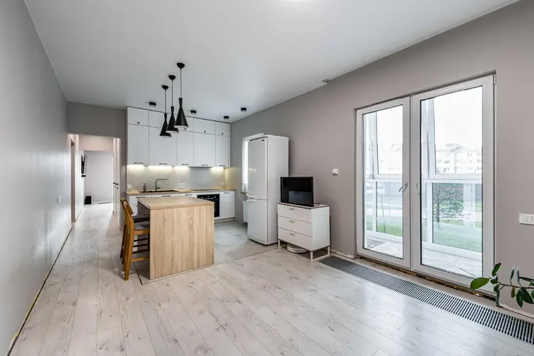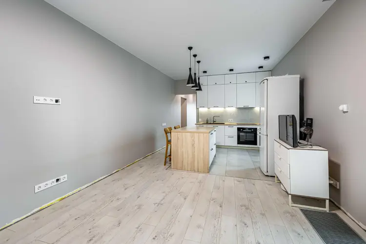 В квартире качественный ремонт, который немного не закончен. Все стены выровнены и окрашены в актуальные цвета, напольное покрытие в зоне кухни-керамогранит, на остальной площади ламинат одним полотном.
