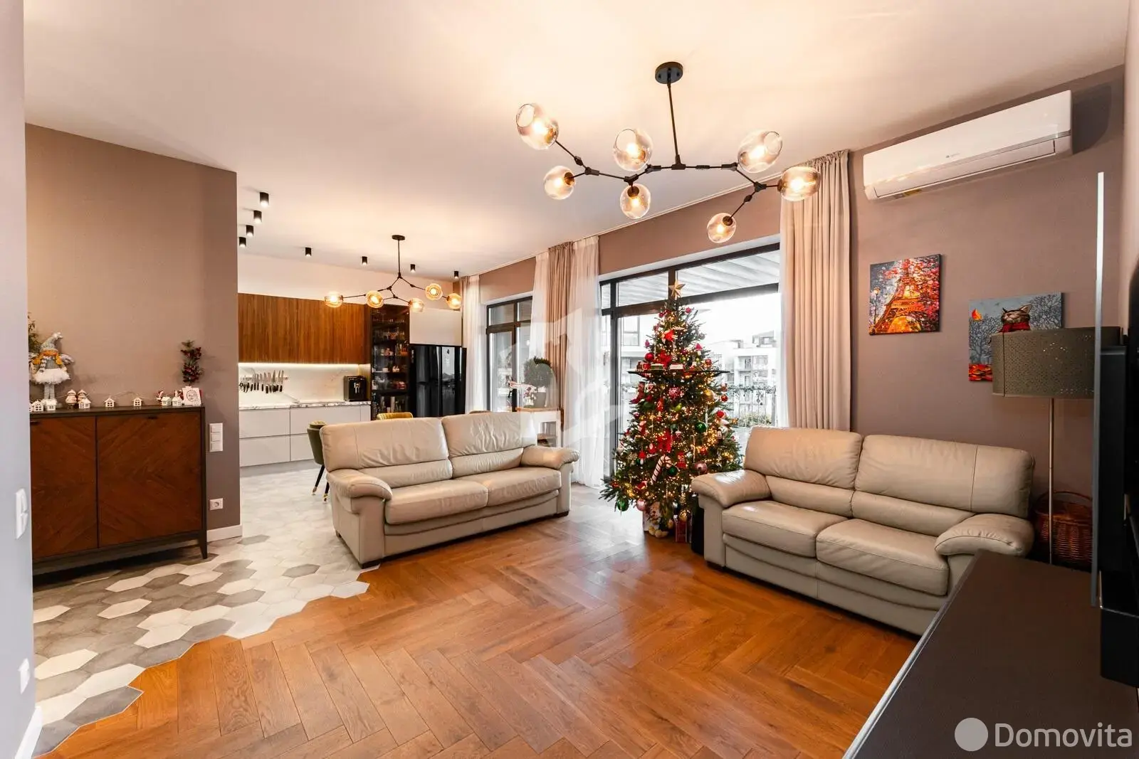 На полу крупноформатная плитка, в жилых комнатах паркетная доска.
