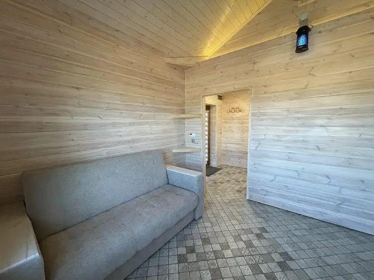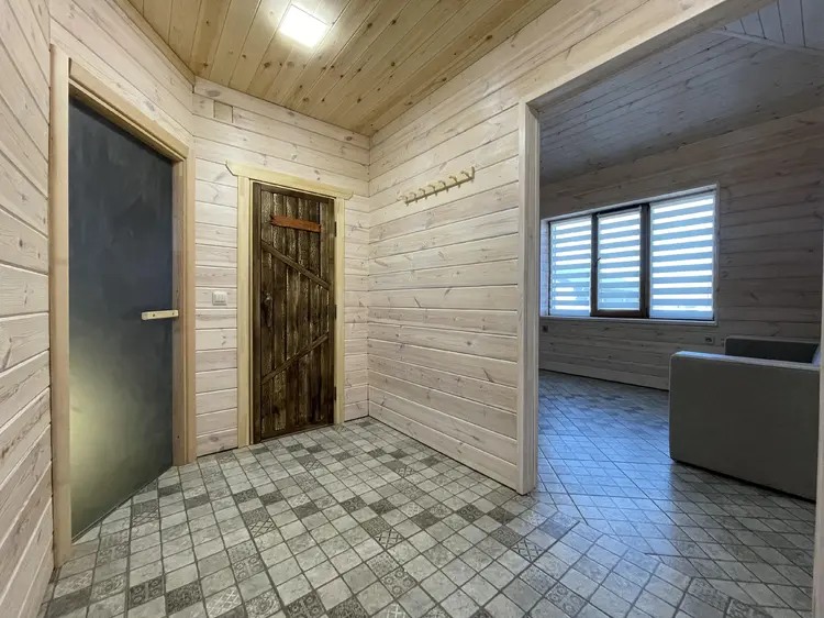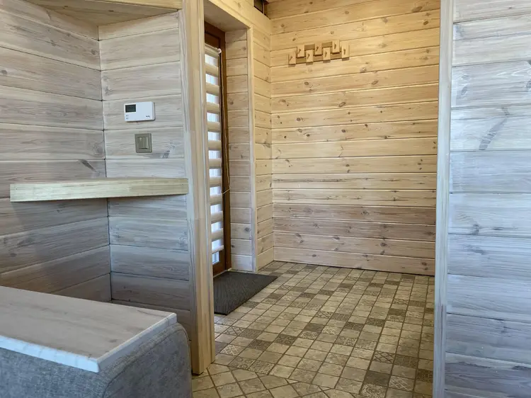 Внутренняя отделка парной выполнена из массива ольхи. Для мягкого, оздоровительного пара и быстрого нагревания в каменке уложены минеральные камни жадеит и талькохлорит. Солевые светильники из гималайской соли. Установлена система басту, что обеспечивает регулирование интенсивности воздухообмена в парной.