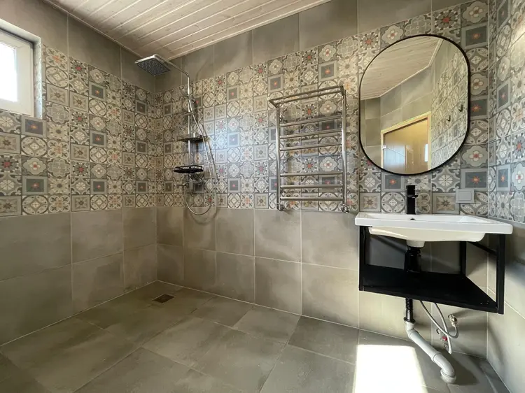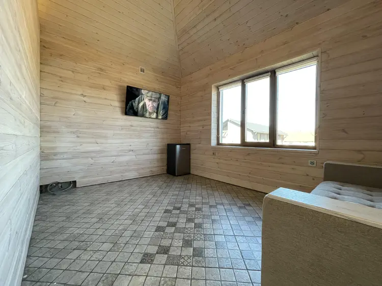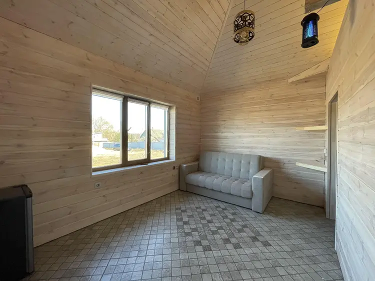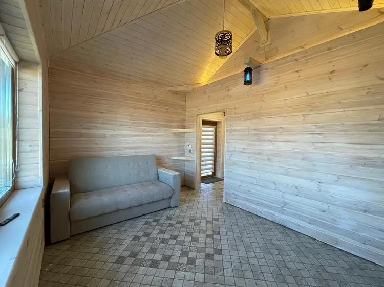 Внутренняя отделка стен и потолка имитацией бруса, в санузле -плитка. Окна и входная дверь - профиль REHAU, рольшторы. Для дополнительного комфорта по всему дому установлена система водяного теплого пола под плитку (3 контура). Используется электрокотел ARTI с встроенным термостатом.