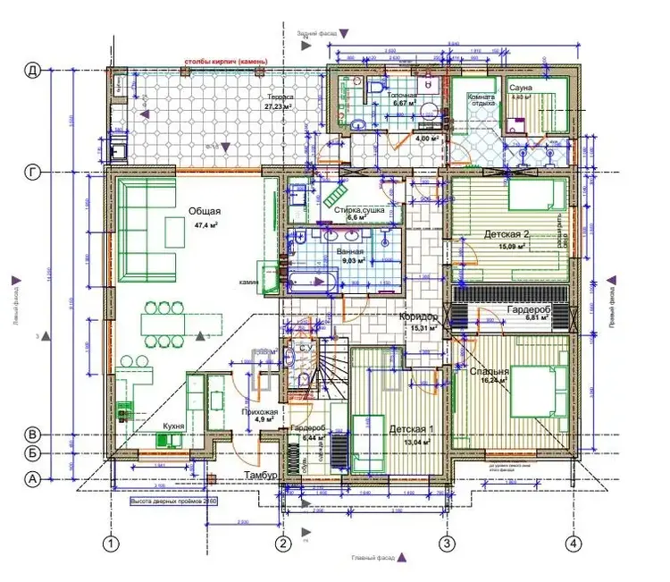 - Фасадная часть – бельгийский кирпич Vandersanden, баварская кладка.