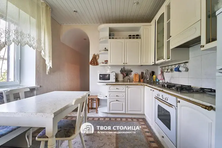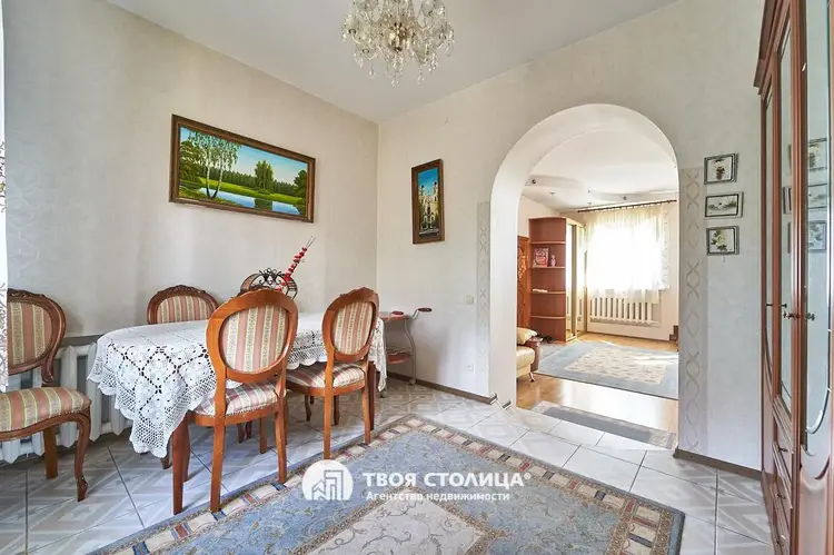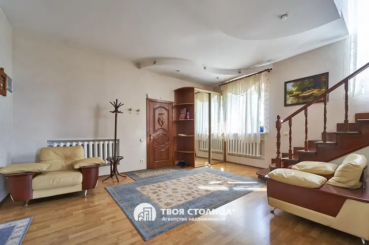Продаётся черырехуровневый коттедж с личным парком в курортной зоне Минска.Коттедж расположен в аг.Сёмково, в престижном районе, в 10 км от Минска и в непосредственной близости от Минского моря.Коттедж построен на ровном участке прямоугольной формы площадью 22,9 сот.Технические характеристики дома:- фундамент и цокольный этаж – ж/б блоки,- стены наружные и внутренние 1 и 2 этажа – кирпич (наружные стены оштукатурены и покрашены),- перекрытия 0-1-2 этажей – бетонные плиты,- кровля – жестяные листы.Площадь дома:- общая – 272,8 м2,- жилая – 107,8 м2,- цокольный этаж – 89,1 м2.В доме имеется четыре уровня:- на 0-ом уровне (цоколь) расположены: гараж на 2 а/м (33,6 м2), 3 кладовых и котельная;- на 1-ом уровне расположены: закрытая веранда (12,5 м2), гостиная (26.5 м2), зал (23,1 м2), кухня (9,1 м2) с выходом на открытую веранду, столовая (11,2 м2) и совмещённый с/у (5,1 м2);- на 2-ом уровне расположены 4 жилых комнаты: 3 спальни 15,0 м2, 15,9 м2, 16,9 м2 соответственно, застеклённая лоджия, кабинет 10,4 м2, гардеробная и с/у. На второй этаж ведёт массивная и комфортная лестница из массива дерева;- на 3-м уровне расположено неотапливаемое помещение (35 м2), которое может использоваться как летняя спортивная-игровая комната.Изюминкой этого дома является большой и ухоженный участок, который представляет собой собственную парковую зону. В углу участка в окружении пушистых сосен стоит баня.Большим плюсом также является близость Минского моря, до пляжа 2,7 км – 7 мин на машине или 25 мин пешком.Аг.Сёмково отличное транспортное сообщение с Минском и развитая инфраструктура. Есть магазины, детский сад, школа, амбулатория, почта, парикмахерская.Приглашаем Вас собственными глазами увидеть этот дом и погулять по собственному парку.Купить квартиру в Минске- легко и выгодно вместе с агентством недвижимости " Твоя столица"!Получите консультацию по подбору и покупке квартиры в Минске у опытных риэлтеров.Актуальная база квартир- Минск и пригород, Цены, фото, планировки.Приходите на консультацию риэлтера для покупки. Наш офис находится по адресу: Минск, Кирова, 8 ООО "Твоя столица", УНП 101136973, лицензия №02240/15 от 17.02.05г.
