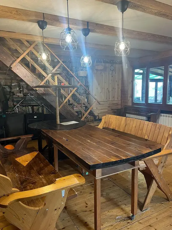 Первый этаж: веранда-прихожая, гостиная, столовая и кухня объединены в общее пространство. Камин. Также на 1 этаже находится кабинет, санузел, душевая, большая парилка с печью на дровах, котельная.