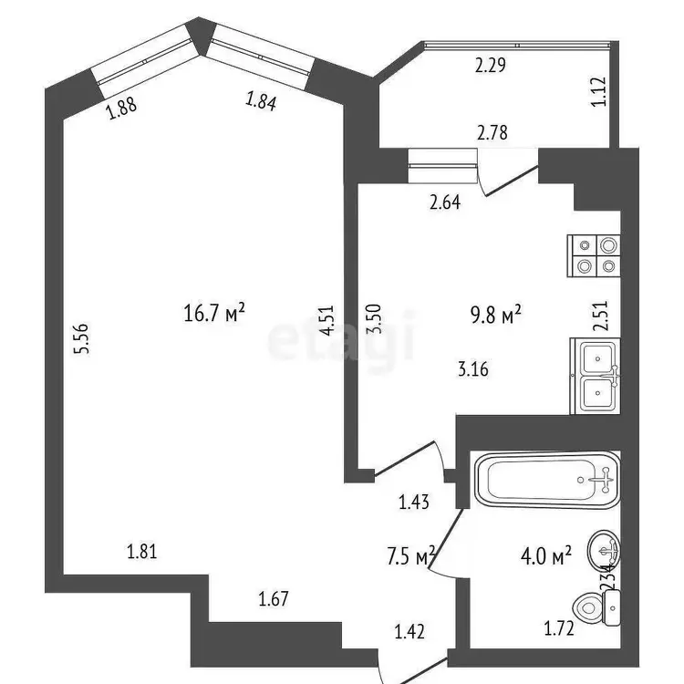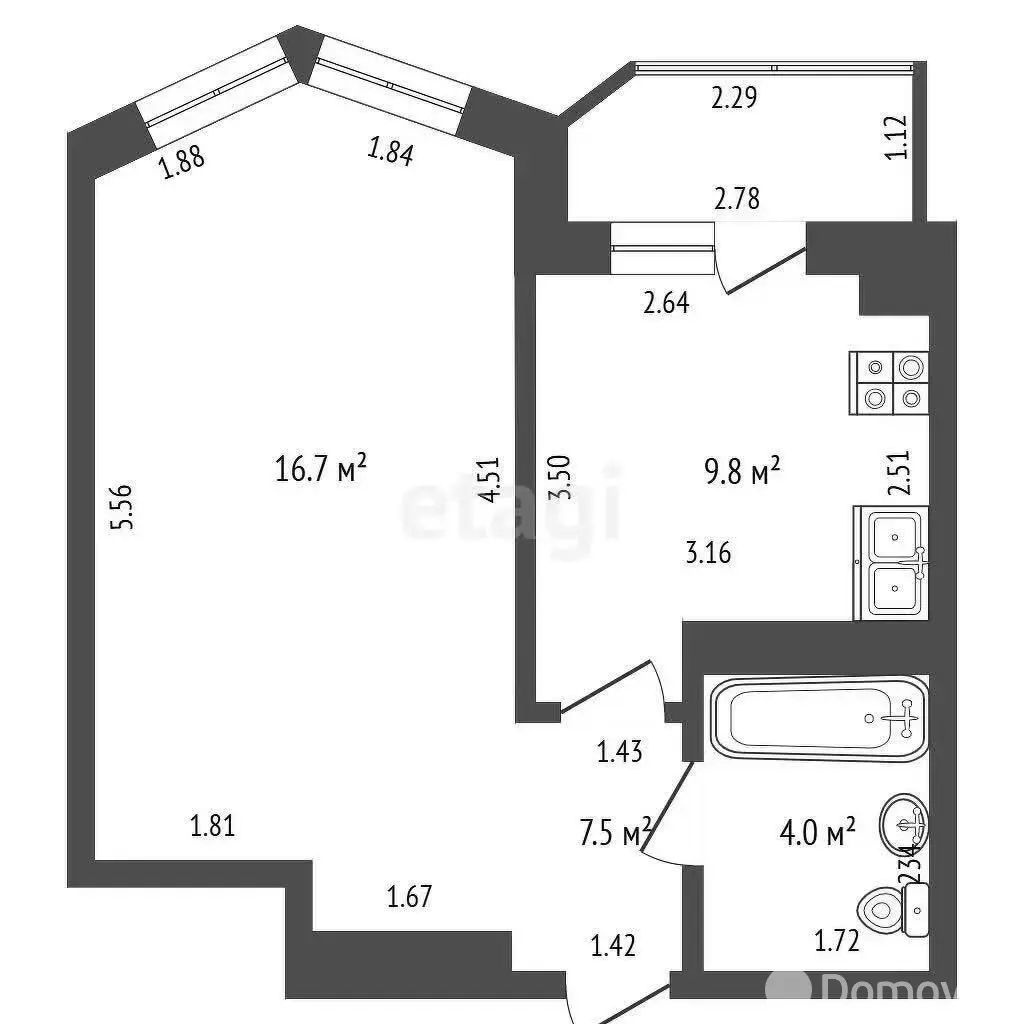 - 38 м2 (по СНБ 40,1 м2), жилая — 16,7 м2