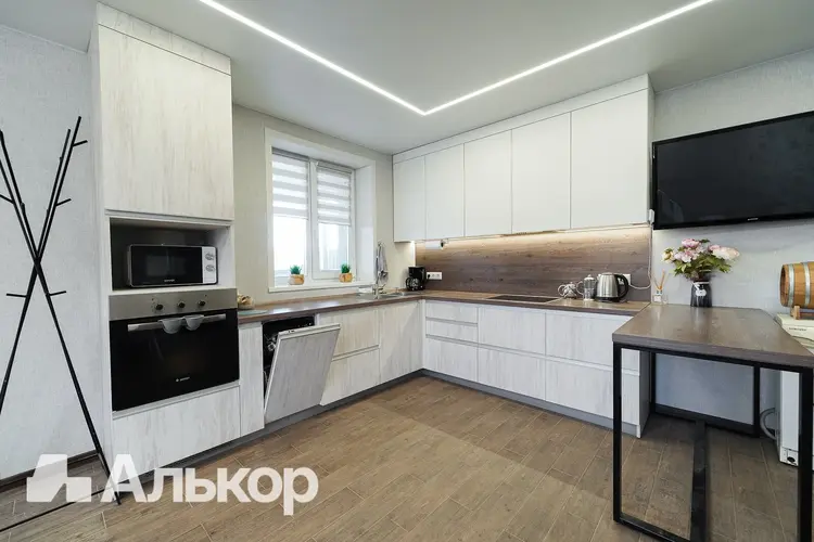 - Кухня: встроенная с плитой, духовым шкафом, вытяжкой, посудомоечной машиной.
