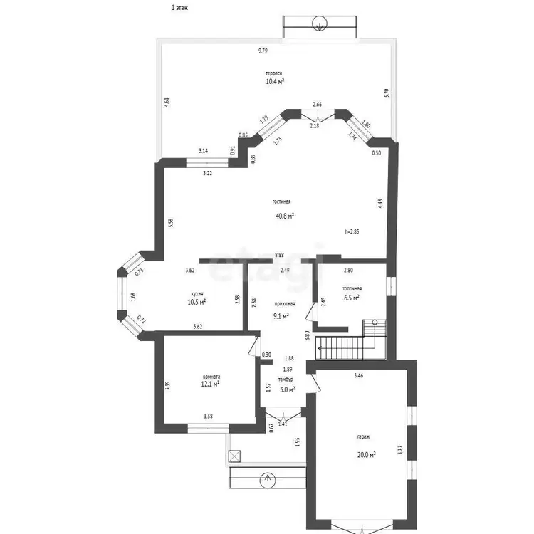 1-й этаж: гостиная/офисная зона, кухня, встроенный гараж (20 м2).