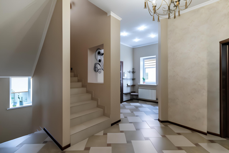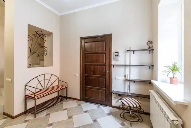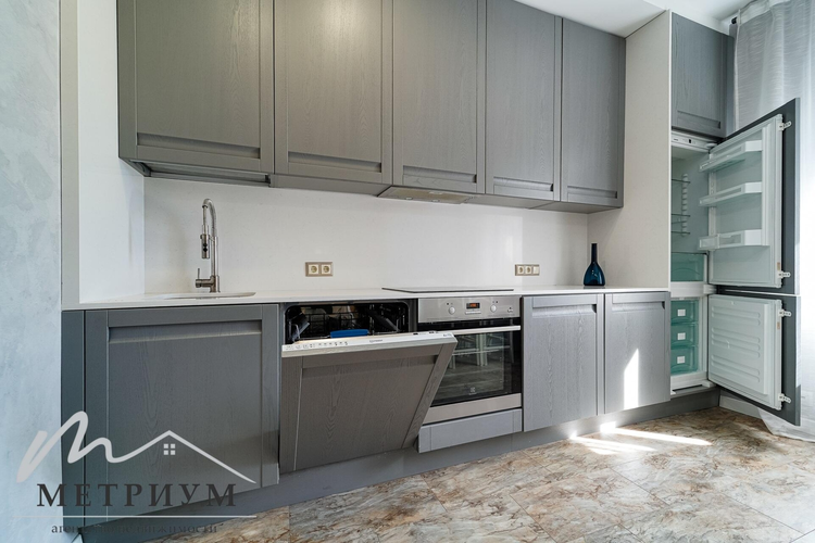 Первый этаж состоит из кухни-столовой, просторной гостиной с камином и выходом на террасу, второй этаж – 4 жилых комнаты и санузел. В доме предусмотрен цокольный этаж с санузлом, кладовой и 2-мя комнатами.