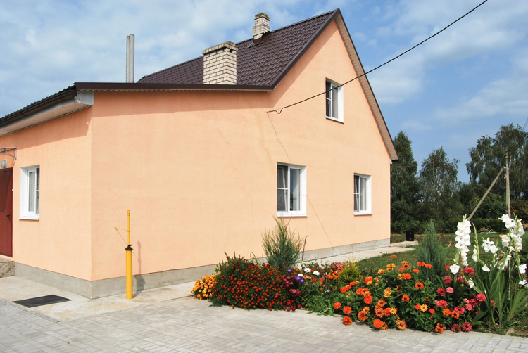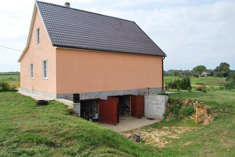 Дом имеет три уровня: цокольный этаж (с гаражом), жилой этаж, мансарда.