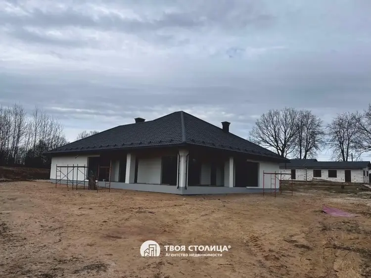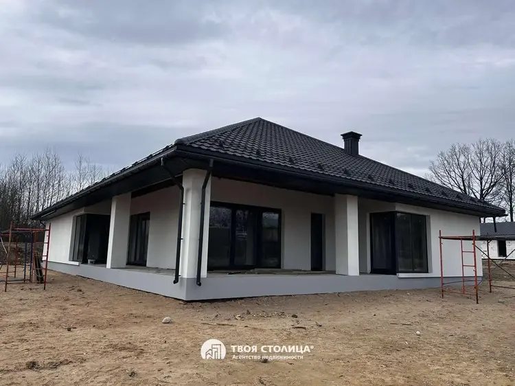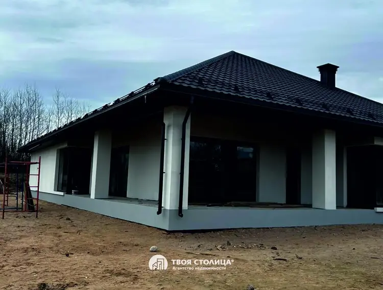 Дом на финальной стадии строительства: крыша полностью готова, дом утеплен, фасад оштукатурен и покрашен, установлены большие панорамные окна, проведены коммуникации. Вам остаётся только выбрать стиль интерьеров и завершить отделку под себя — основная сложная работа уже сделана.