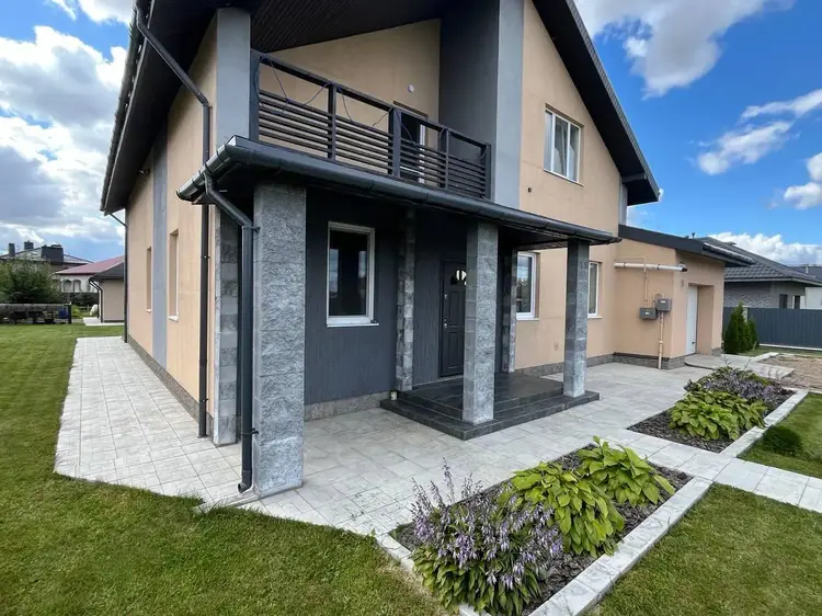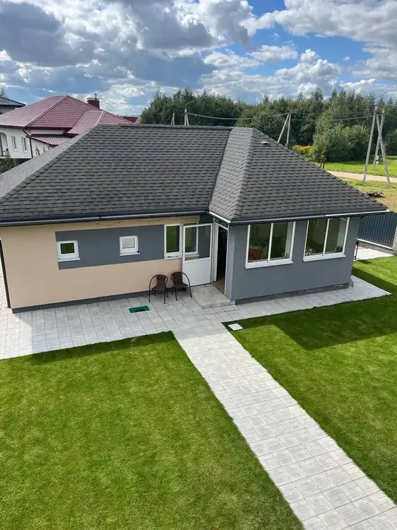 - Дом построен из толстых блоков с хорошей звуко- и теплоизоляцией. Материал крыши – металлочерепица.