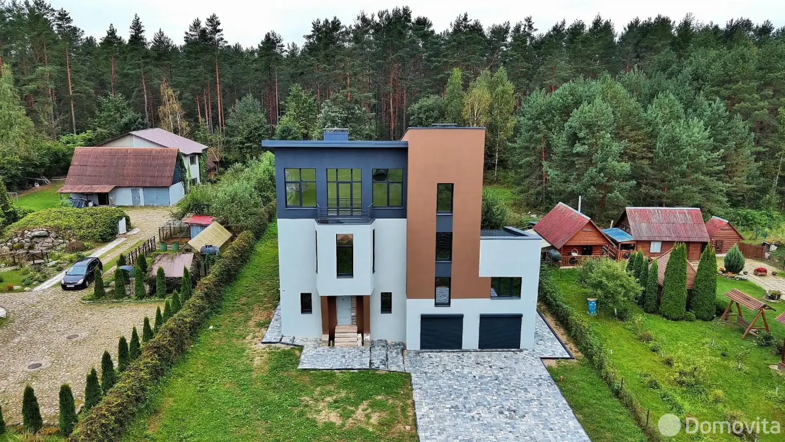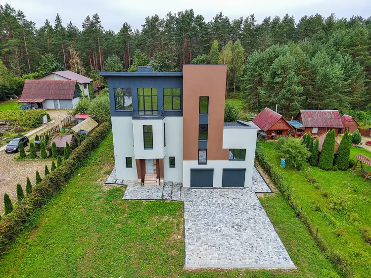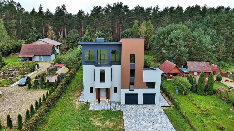 Перекрытия на всех уровнях железобетонные. В доме уже организована монолитная бетонная лестница, пространство помещений разделено перегородками. Два отдельных гаража с роллетными воротами дистанционного подъема. А из панорамных окон мансардного этажа открывается вид на озеро и лес!