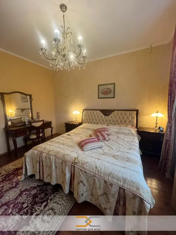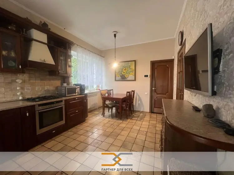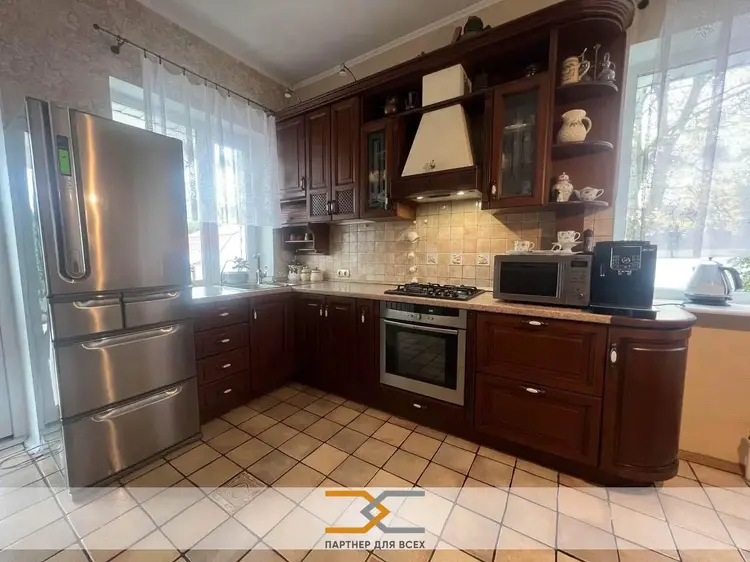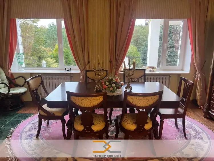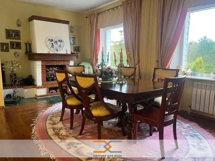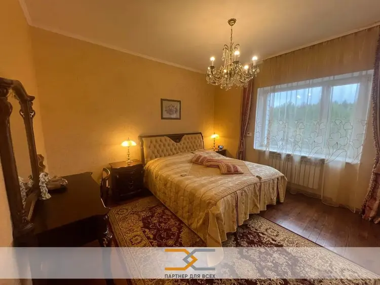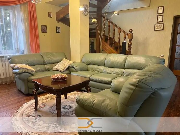 - 1-й этаж: кухня 15 м.кв., кухонный гарнитур дуб-массив, техника: газовая панель и духовой шкаф, вытяжка NEFF (производство Германия), холодильник и телевизор TOSHIBA (производство Япония); гостиная 46.9 м.кв с камином, обеденной группой, сервантами, кожанным диваном и домашним кинотеатром LG; 2 спальни по 15 м.кв; санузел – инталляция производство Испания и Италия, душевая кабина, стиральная машина LG; гардеробная 14.4 м.кв с сушилкой автоматом производства Bosch находится рядом с библиотекой и шкафом-купе.