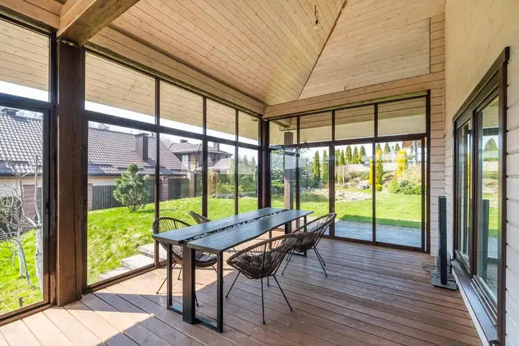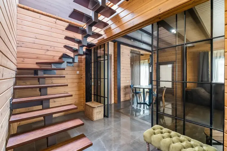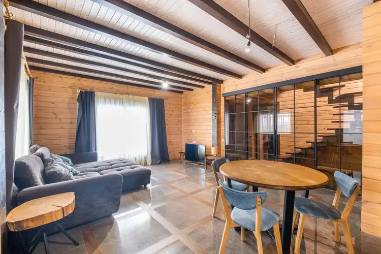 Дом выполнен по индивидуальному архитектурному дизайн-проекту, в ЭКО-стиле. Использовались высококачественные импортные европейские строительные материалы. Материал наружных и внутренних стен – клееный брус. Дерево наполняет дом уютным ароматом, обеспечивая высокую прочность, долговечность конструкции и комфортный микроклимат круглый год.