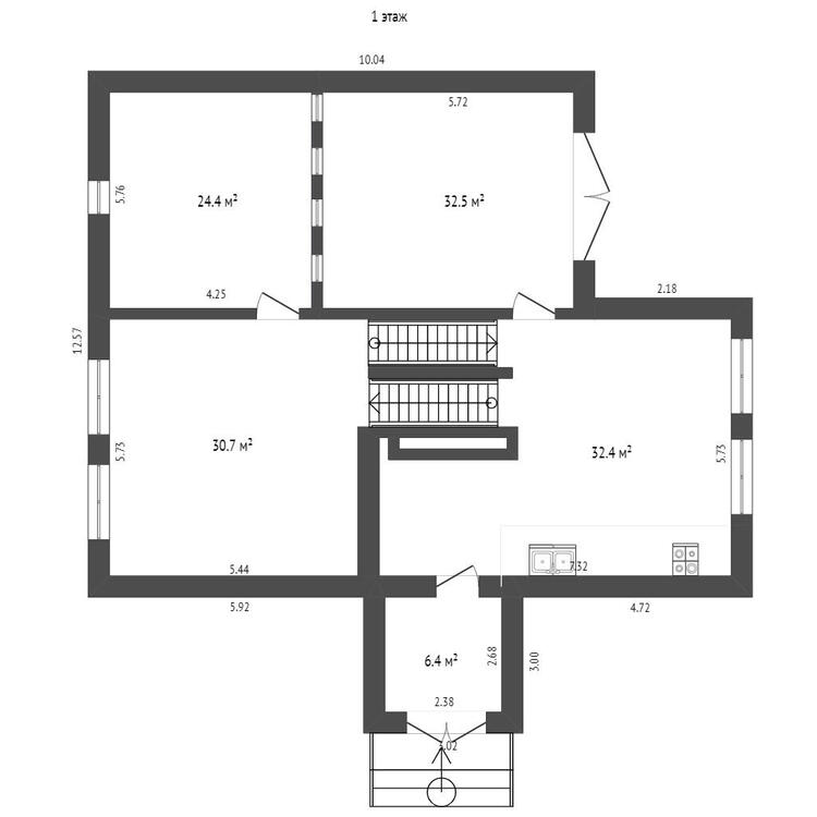 Первый этаж: просторная гостиную 30,7 м2, кухня 24 м2 и жилая комната 24,4м2. На первом этаже оборудован гостевой санузел. Из дома выход в гараж - 32,5 м2, за гаражом ещё помещение 24м2.