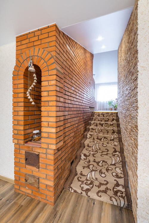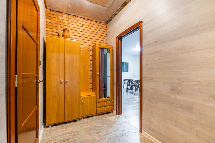 В качестве напольных покрытий в зависимости от зон использовались плитка и ламинат. Стены отделаны жидкими обоями и листовыми обоями, в санузлах керамической плиткой.