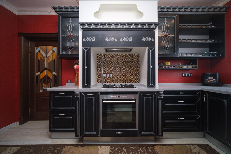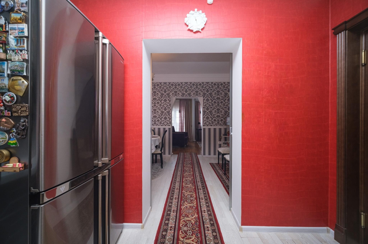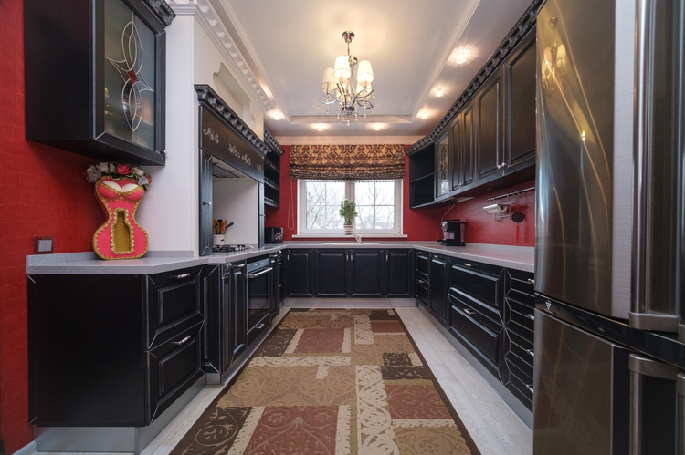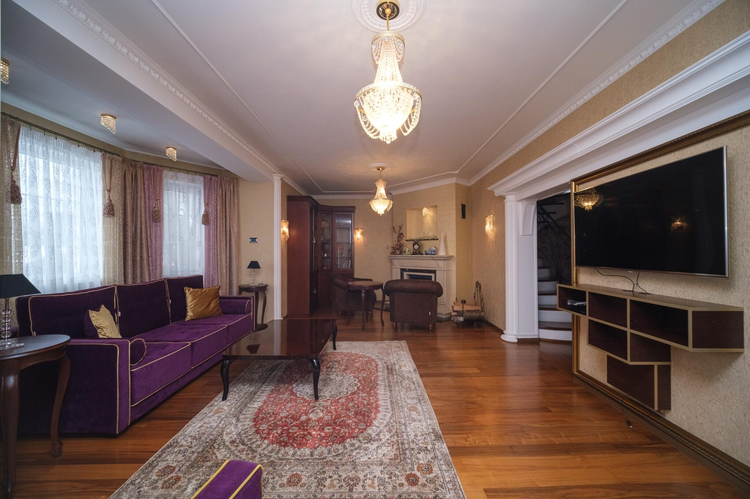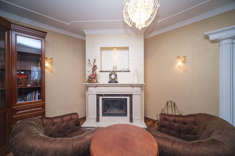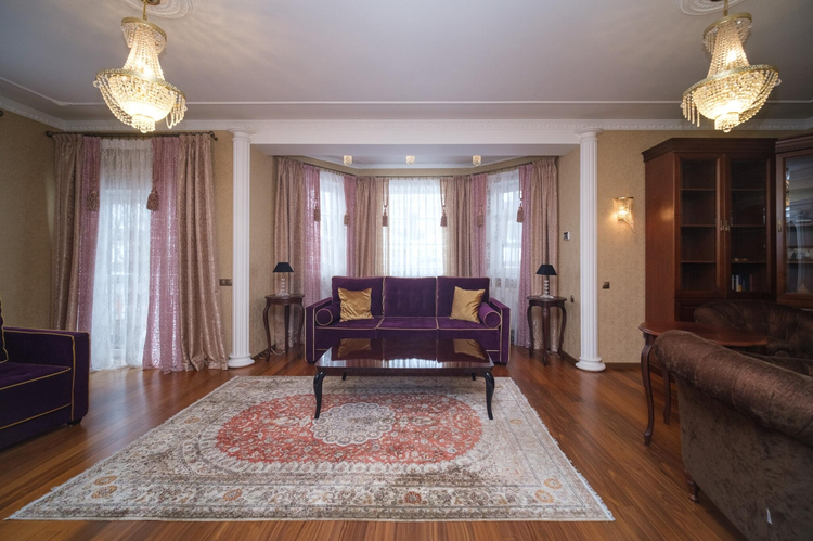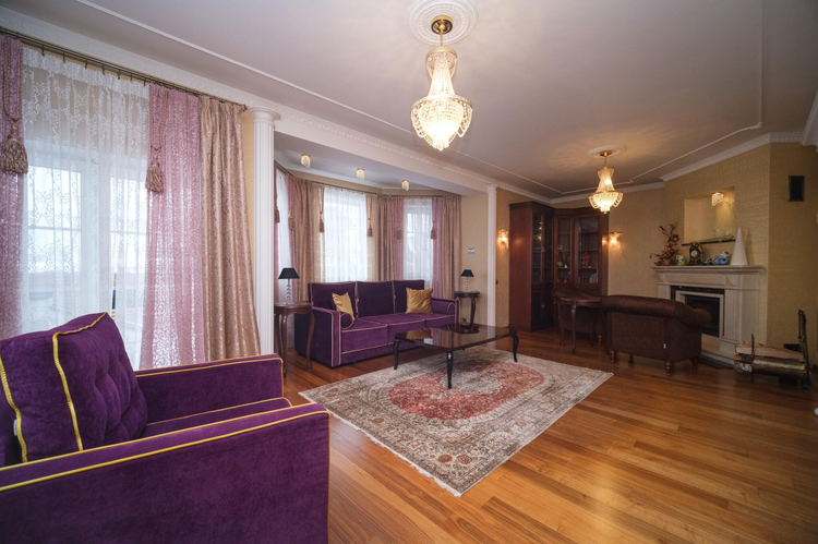 Дизайн интериера выполнен в стиле борокко. Межкомнатные двери - массив альхи с витражным стеклом, окна - "Rehau", пол - паркетная доска "Tarket" (финский), премиальная мебель из массива, люстры - чешский хрусталь, мебель детских комнат - "Celik" (Турция), спальная - "8 Марта" (Московская фабрика элитной мебели), мебель кухни - работа известного беларуского краснодеревщика, обеденная группа столовой из массива дуба "Пинскдрев", художественная фреска ручной работы. Техника кухни "Siemens" премиального сегмента для проффесиональной готовки.