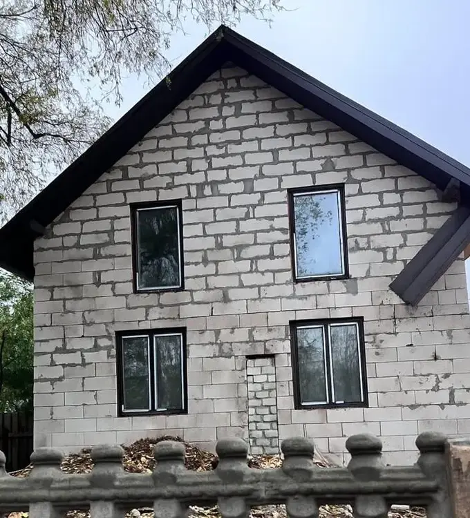 Стены выполнены из газосиликатных блоков, внутренние перегородки — блок/кирпич, перекрытия — деревянные. Окна ПВХ. Полы – стяжка. Крыша – ондулин.