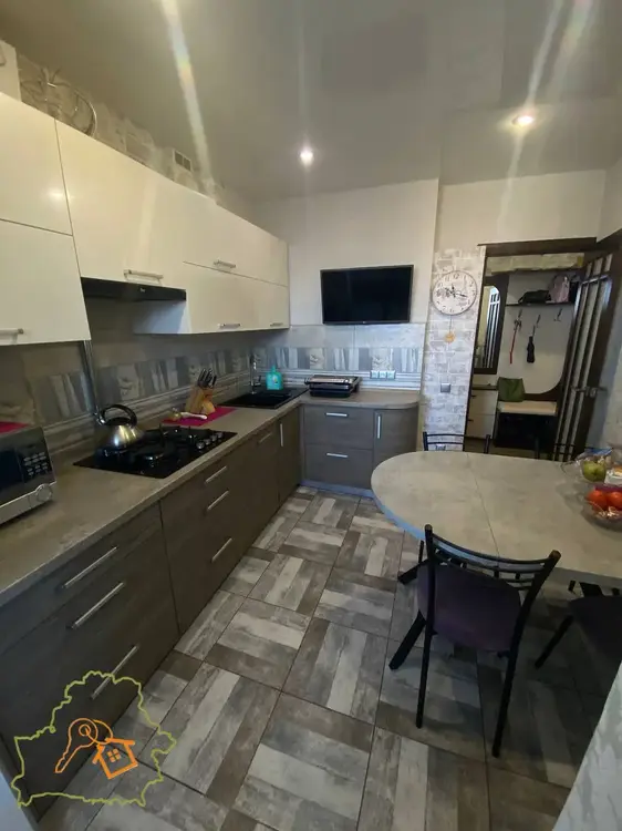 Пол - ламинат, плитка, легко поддерживать в чистоте. Окна ПВХ, на две стороны дома - отличная шумо - и теплоизоляция. Натяжные потолки, межкомнатные двери из массива. Свежая электропроводка и сантехника. Установлена сигнализация.