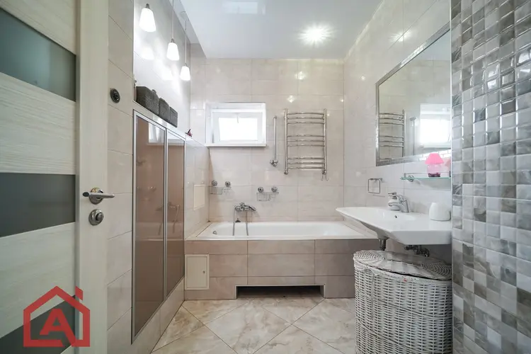 Материалы и конструкция: дом построен на ленточном фундаменте из керамзитобетонных блоков, утеплен и облицован качественными материалами. Кровля выполнена из мягкой черепицы, что обеспечивает надежность и долговечность.