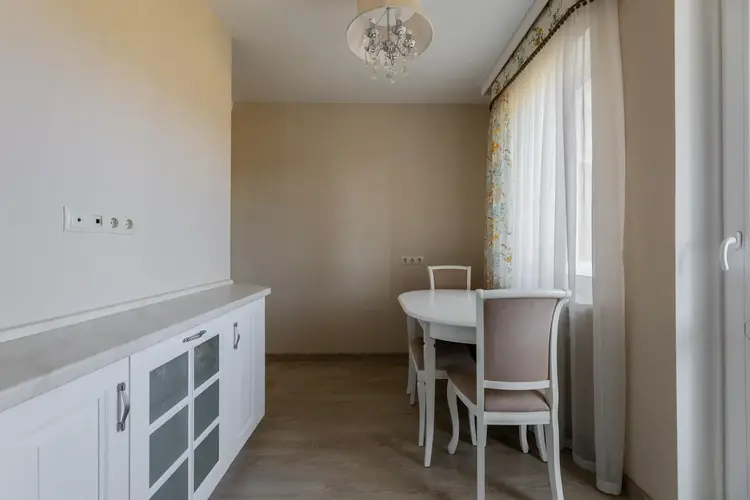 Кухня встроенная, из натурального ясеня. Варочная поверхность и духовой шкаф Bosch. Вытяжка Elica. Холодильник Gorenje. Кухонный фартук выложен итальянской плиткой, пол в кухне - плитка (производство Италия). Смеситель Hansgrohe.