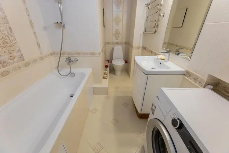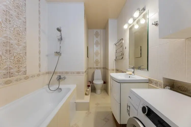 Санузел - 3.22 кв.м. Стены и пол выложены плиткой (производство Керамин), серия «Органза», унитаз производство также Керамин, умывальник Cersanit. Смесители Hansgrohe.