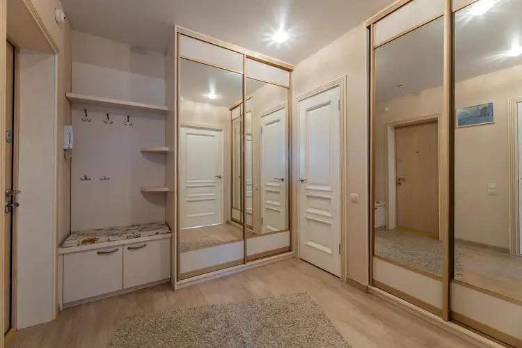 В коридоре установлены 2 шкафа-купе, вешалка с тумбой для обуви. Также в квартире оборудована гардеробная. Лоджия застеклена (ПВХ)