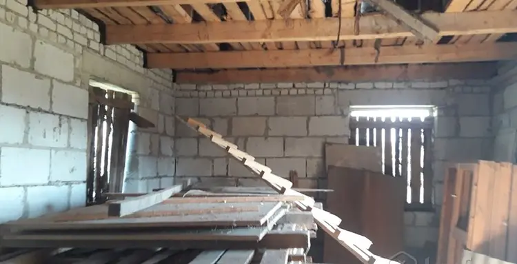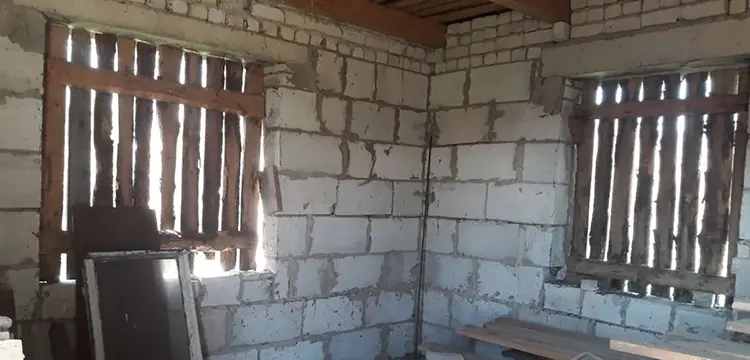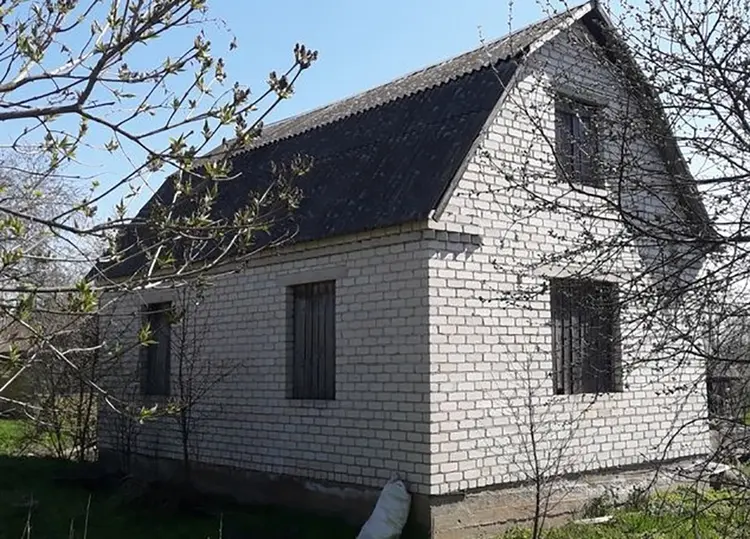 Дом одноуровневый, из газосиликатных блоков, 2015 года постройки. Общая площадь — 36,9 кв. м, степень готовности жилого помещения — 54%. Внутри одна комната и кухня. Входная дверь деревянная, окна и полы отсутствуют. Кровля шиферная.
