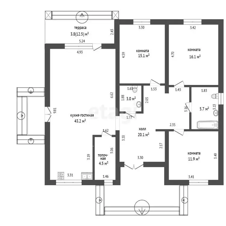 Просторная кухня-гостиная площадью 43,2 м2 с выходом на террасу — идеальное пространство для жизни и отдыха.