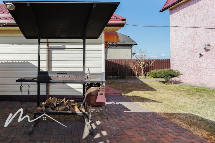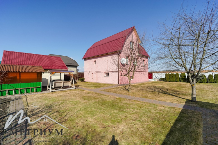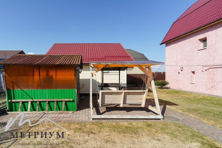 На территории выполнен ландшафтный дизайн: туи, плодовые деревья — черешня, яблоня, 10 кустов голубики, 2 куста черной смородины, а также уютная зона отдыха с беседкой, отдельно стоящей русской баней с отоплением и подведенным водоснабжением. В бане большая комната отдыха и установлен бассейн. Вход на мансардный этаж бани с улицы – можно использовать для хранения сезонных вещей и уборочного инвентаря.