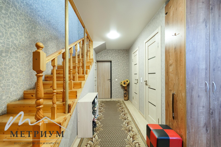 На первом этаже расположен просторный гараж, кладовая, топочная. Вход в гараж осуществляется как с улицы через подъемные дверями с электроприводом, так и с дома. В прихожей находится раздельный санузел с душевой кабиной. На второй этаж ведет крепкая и удобная лестница с поручнем, что будет безопасно и комфортно для любого возраста.