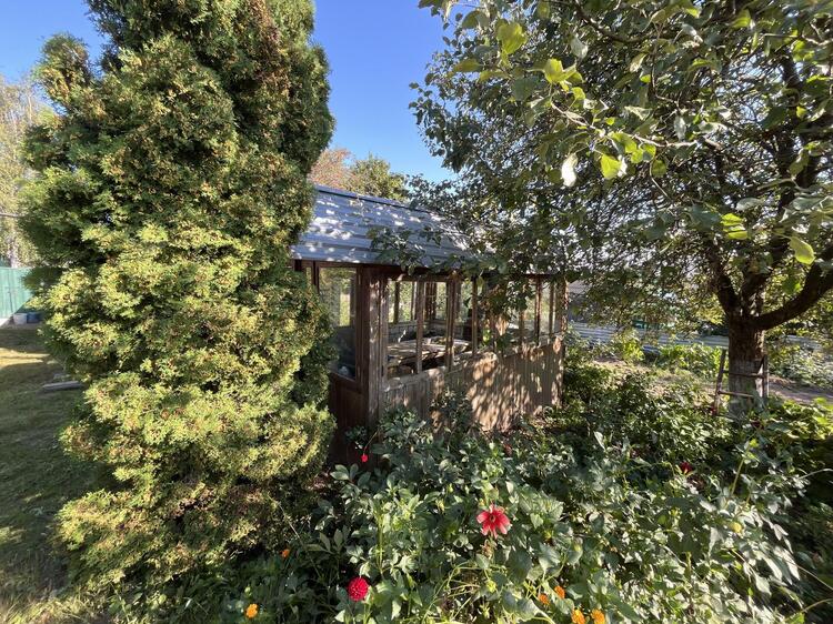 Ухоженный просторный участок 10,97 соток, на участке гараж, беседка, сараи, теплица, плодовые деревья. Площадь позволяет поставить качели и бассейн.