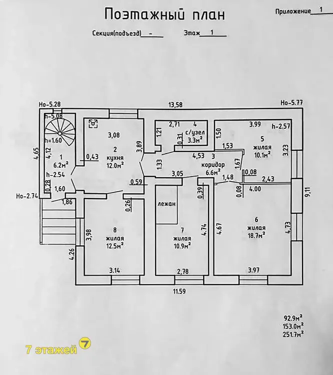 Общая площадь здания-251,7 кв.м/общая площадь жилых помещений-153,0 кв.м./жилая площадь-92,9 кв.м.
