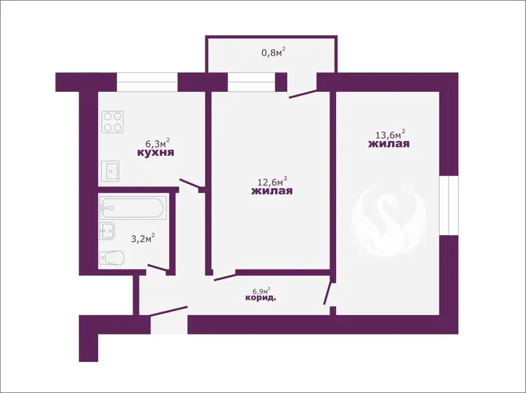 - Общая площадь квартиры составляет 42,6 м2, из которых 26,2м2 — жилая зона, а кухня — 6,3 м2. Две изолированные комнаты обеспечивают комфорт и уединение для всей семьи.