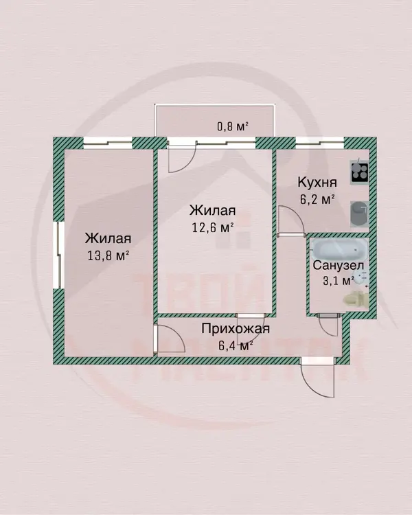 Квартира располагается на 4 этаже, просторные жилые комнаты 13,8 и 12,6 кв.м. В квартире установлены окна ПВХ, металлическая входная дверь, счетчики на коммуникации.