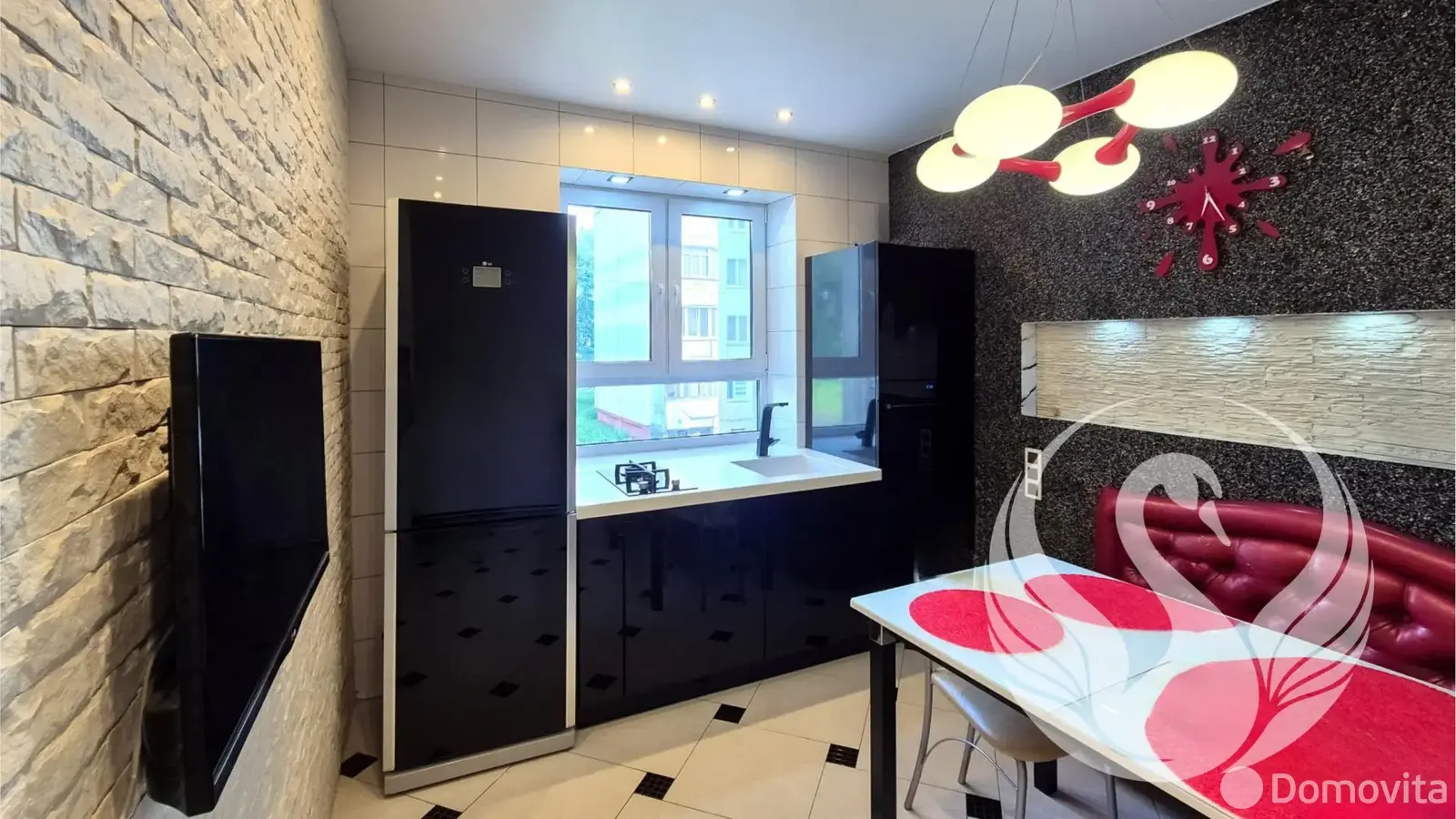 - Встроенная кухня с фурнитурой Blum, столешницей из иск. камня и мойкой около окна - мечта любой хозяйки. Холодильник в тон всей кухни будет приятным дополнением.